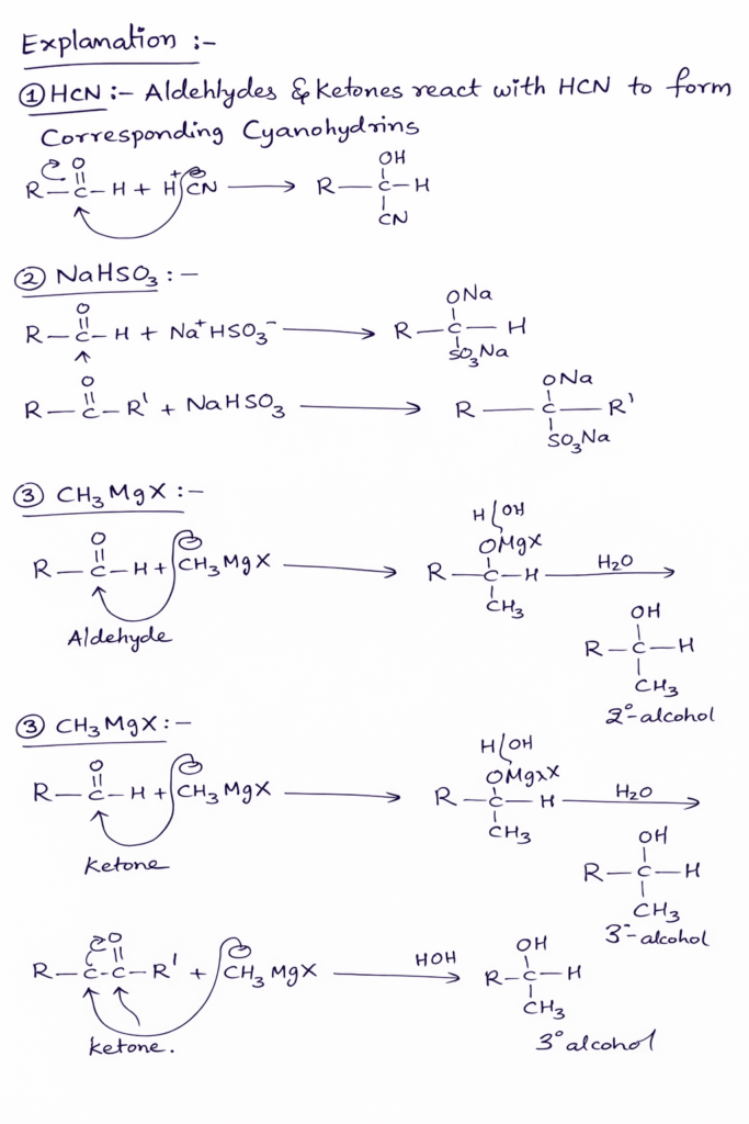 For example, Acetaldehyde reacts with HCN to form acetaldehyde cyanohydrin. Acetone or 2- propanone is reacting with HCN to form acetone cyanohydrin.