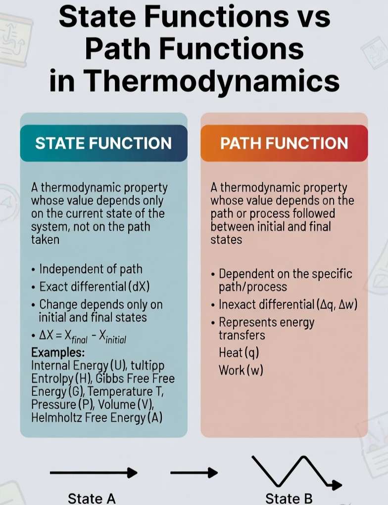 - Expressed using inexact differentials (δq or δw, where integration requires full knowledge of the path).