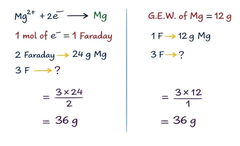 Passing of one Faraday current through an aqueous solution, Equivalent weight of a substance is deposited. When we pass one Faraday current through an aqueous solution of Magnesium bromide, 12 gm of Mg is deposited then how many grams of mg is produced after passing of three faraday of current which results three times of 12 will be deposited. That means, 36 grams of magnesium is deposited at the cathode when we pass 3F current through the solution.